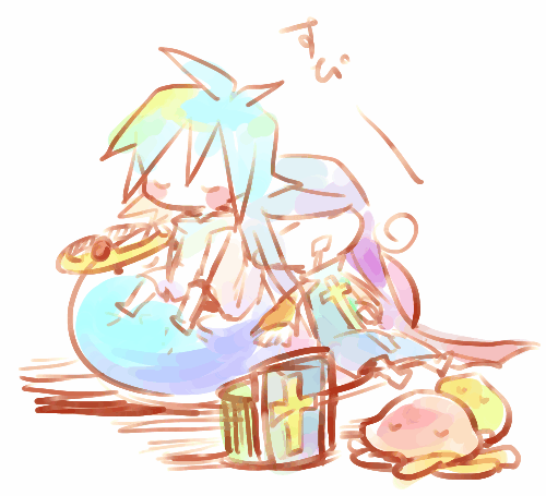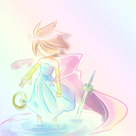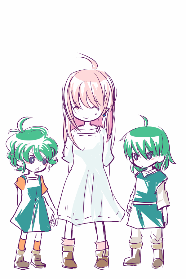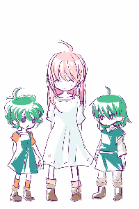 途中データのタイトルが「スライムピアス漫画」で、シンシアおねーちゃん(↑の真ん中ピンクの方)がでばってるので、多分スライムピアスはシンシアのものだよ!ソロとソフィアが二人とも片方ずつしかつけてないのはいっこずつもらったからだよ!!みたいな漫画描こうとしたんでしょうね、多分。そして多分勇者たちは双子設定です。双子いいよね。